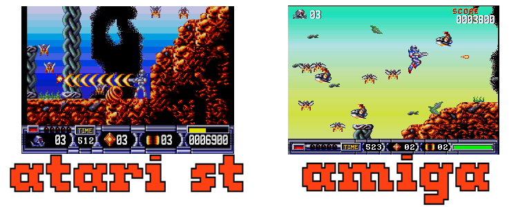 How did Atari manage this? Well, unlike the Amiga with it’s custom Blitter graphics and PAULA audio hardware, the ST was a much simpler machine, which naturally kept costs down. And in the early years of both systems lives, this made the ST the more popular machine for those upgrading from the existing 8bit machines out there. This was especially noticeable in the games released for both systems, where the Amiga versions were often quick & dirty ports of the ST game with none of the custom hardware used to enhance anything.